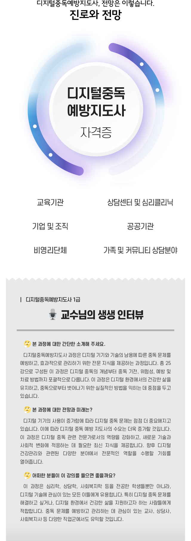 • ÀÎÅͳÝÀ̳ª ½º¸¶Æ®Æù ¶Ç´Â SNSÁßµ¶ µîÀÇ °³³ä ¸ðµÎ¸¦ Æ÷°ýÇÏ¿© µðÁöÅÐÁßµ¶°ú µðÁöÅÐ Áßµ¶Àå¾Ö(digital addiction disorder)¸¦ Æ÷ÇÔÇÏ¿© ¿¹¹æÇÏ´Â ÇÁ·Î±×·¥À» °³¹ß °ü¸® ÁöµµÇϰí ÇöÀå¿¡¼­ Áßµ¶»ó´ã°ú ¿¹¹æÁöµµ°¡ °¡´ÉÇÑ µðÁöÅÐ Áßµ¶¿¹¹æ Àü¹® Áöµµ»ç¸¦ ¾ç¼ºÇÔÀ» Á÷¹«³»¿ëÀ¸·Î ÇÑ´Ù.