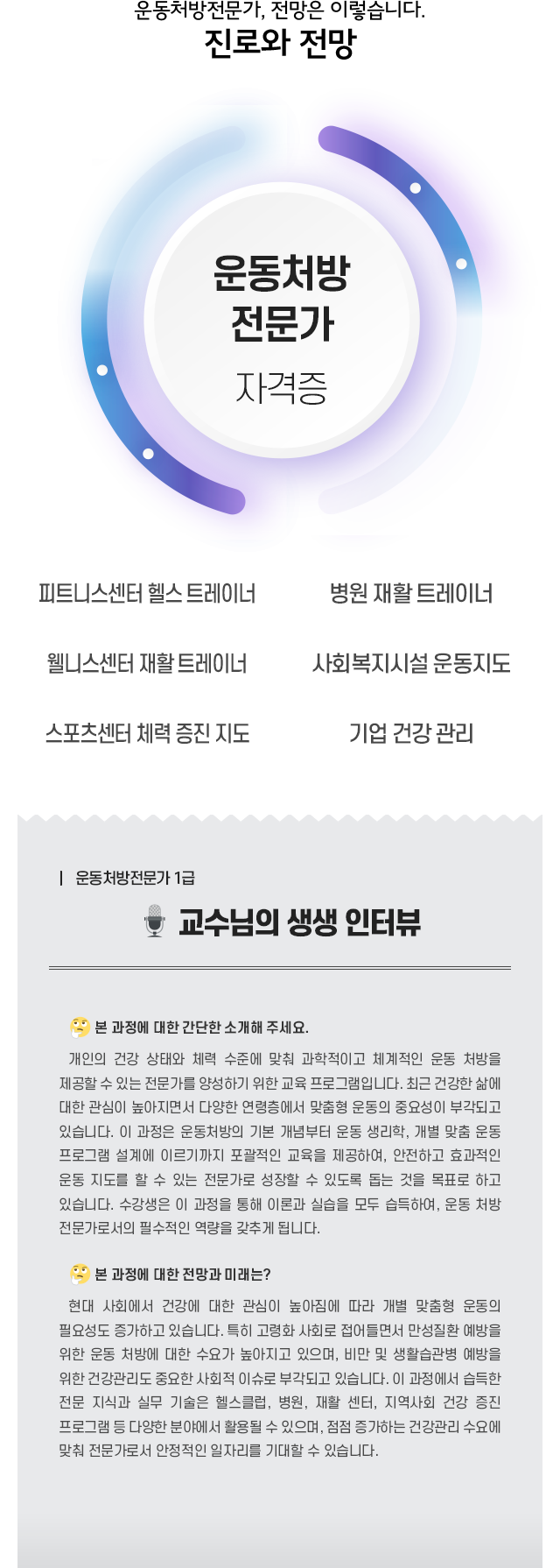 • "¿îµ¿Ã³¹æÀü¹®°¡" °úÁ¤ÀÇ ¸ñÇ¥´Â ¿îµ¿ÀÌ ÇÊ¿äÇÑ »ç¶÷µé¿¡°Ô °úÇÐÀûÀ̰í ü°èÀûÀÎ ¿îµ¿ ó¹æÀ» Á¦°øÇÒ ¼ö ÀÖ´Â Àü¹®°¡¸¦ ¾ç¼ºÇÏ´Â °ÍÀÔ´Ï´Ù. ÀÌ °úÁ¤Àº °³ÀÎÀÇ °Ç°­ »óÅÂ¿Í Ã¼·Â ¼öÁØÀ» ¹ÙÅÁÀ¸·Î ¸ÂÃãÇü ¿îµ¿ ÇÁ·Î±×·¥À» ¼³°èÇϰí, ¿Ã¹Ù¸¥ ¿îµ¿ Áöµµ¸¦ ÅëÇØ ü·Â ÁõÁø°ú °Ç°­À» µ½´Â °ÍÀ» ¸ñÇ¥·Î ÇÕ´Ï´Ù. ¿îµ¿ ó¹æÀÇ °³³äºÎÅÍ ¿îµ¿ »ý¸®Çаú °¢ ¿îµ¿ÀÇ È¿°ú¿¡ À̸£±â±îÁö À̷аú ½Ç½ÀÀ» ¸ðµÎ Æ÷ÇÔÇÏ¿©, ¼ö·áÀÚ´Â Àü¹® Áö½Ä°ú ½Ç¹« ´É·ÂÀ» °®Ãá ¿îµ¿ ó¹æ Àü¹®°¡·Î ¼ºÀåÇÒ ¼ö ÀÖ½À´Ï´Ù.