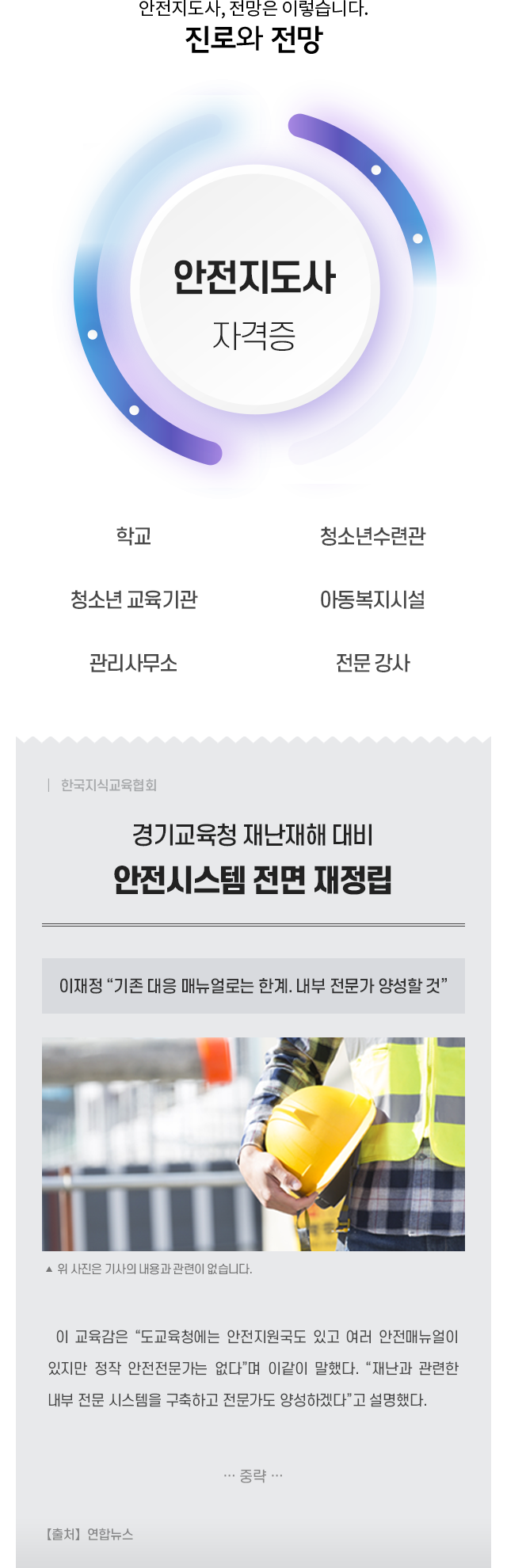 • ÀÌ·ÐÁß½ÉÀÇ ±³À°À» ¹ÙÅÁÀ¸·Î Àü¹® ±³¼öÁøÀÇ Ã¼°èÀûÀÎ ÇнÀÀÌ ÀÌ·ç¾îÁý´Ï´Ù. ¾ÈÀüÁöµµ»ç¿¡ ´ëÇÑ ±âº»ÀûÀÎ ÀÌÇØ¿Í ¸ñÀûÀ» Åä´ë·Î ´Ù¾çÇÑ ¾ÈÀüÁöµµ»ç °ü·Ã À̷аú ½Ç¹«¸¦ ÇÔ²² ¹è¿ì°Ô µË´Ï´Ù. ´Ù¾çÇÑ »ç°í¿¡ ´ëÇÑ ¿¹¹æ, »ç°í ´ëó¹ý µî¿¡ ´ëÇÑ ÀÚ¼¼ÇÑ ³»¿ëÀ» ´ã°í ÀÖ¾î »çȸ Àü¹Ý¿¡¼­ ÇÊ¿äÇÑ ¾ÈÀü Áö½ÄÀ» ÀÍÈ÷°í Ȱ¿ëÇÒ ¼ö ÀÖ½À´Ï´Ù.