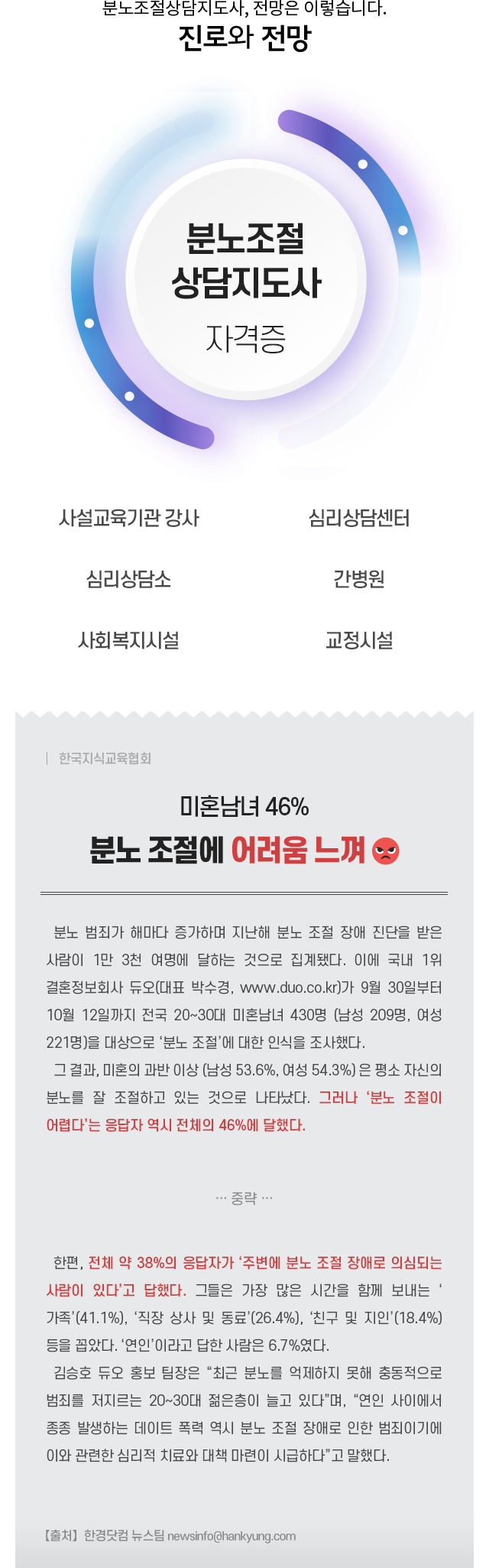 • ÀÌ·ÐÁß½ÉÀÇ ±³À°À» ¹ÙÅÁÀ¸·Î Àü¹® ±³¼öÁøÀÇ Ã¼°èÀûÀÎ ÇнÀÀÌ ÀÌ·ç¾îÁý´Ï´Ù. ºÐ³ëÁ¶Àý¿¡ ´ëÇÑ ±âº»ÀûÀÎ ÀÌÇØ¿Í ¸ñÀûÀ» Åä´ë·Î Á¤¼­ÀÌÇØ, Ãæµ¿Á¶ÀýÀå¾Ö, ÀÎÁöÁ¶Àý ½Ç½À µî ´Ù¾çÇÑ ºÐ³ëÁ¶Àý»ó´ã°ü·Ã À̷аú ½Ç¹«ÀûÀÎ »ó´ãÀ» ÇÔ²² ¹è¿ì°Ô µË´Ï´Ù. ºÐ³ëÁ¶Àý»ó´ã¿¡ ÇʼöÀûÀÎ °­ÀÇ·Î ±¸¼ºµÇ¾î ÀÖÀ¸¸ç, Á¤½Å°Ç°­ÀÇ ÀçȰÀ» À§ÇÑ »ó´ã ¾÷¹«ÀÇ ´Ù¾çÇÑ ÇнÀÀ» ÇÒ ¼ö ÀÖ´Â °­Àǰ¡ ÀÌ·ç¾î Áý´Ï´Ù.