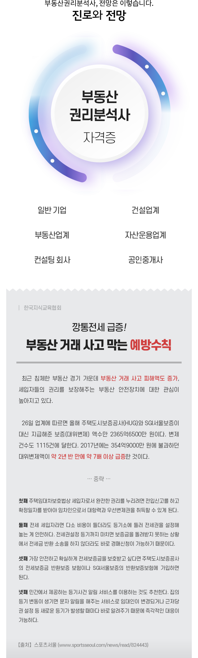 ºÎµ¿»ê±Ç¸®ºÐ¼®»ç Ȱµ¿À» À§ÇÑ ÀÚ°ÝÃëµæ °úÁ¤À» ÅëÇØ ºÎµ¿»ê °Å·¡ÀÇ ¾ÈÁ¤¼º º¸ÀåÀ» À§ÇÑ ºÎµ¿»ê ±Ç¸®¿¡ ´ëÇÑ ÇÏÀÚ À¯¹«¸¦ È®ÀÎÇϰí Á¶»çÇÏ´Â ÀÌ·Ð ¹× ½Ç¹«¿¡ ´ëÇØ¼ ½ÀµæÇϰí, ´ë»ó ºÎµ¿»êÀÇ °Å·¡½Ã »ç°íÀÇ À§ÇèÀ» ¹æÁö ÇÒ ¼ö ÀÖ´Â Á÷¹«¼öÇà ´É·Â ¹è¾çÀ» ¸ñÇ¥·Î ÇÕ´Ï´Ù.