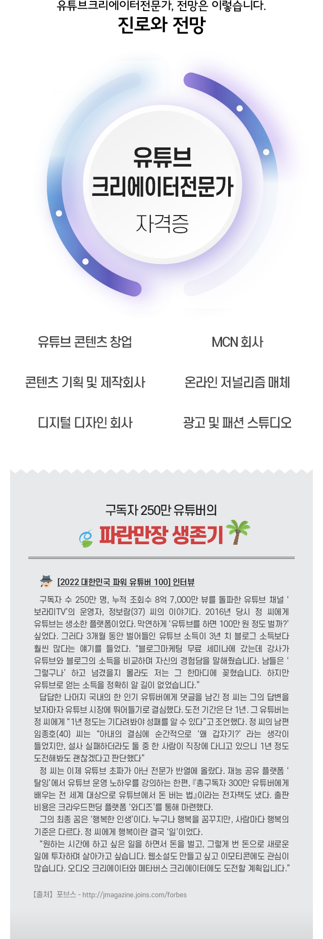 • À¯Æ©ºêÅ©¸®¿¡ÀÌÅÍÀü¹®°¡´Â ÀÎÅͳݿ¡¼­ Á¦°øµÇ´Â À¯Æ©ºê »çÀÌÆ®¸¦ ÅëÇØ µ¿¿µ»óÀ» ±âȹ, ÃÔ¿µ, ÆíÁýÇØ¼­ ¿Ã¸®´Â ¾÷¹«¸¦ ´ã´çÇÑ´Ù. º»ÀÎÀÇ ÄÜÅÙÃ÷¸¦ Á÷Á¢ ¾ÆÀ̵ð¾î ±âȹºÎÅÍ, ÈÄ¹Ý ÀÛ¾÷±îÁö Àü °úÁ¤ÀÇ ÇÁ·Î¼¼½º¸¦ ½ÀµæÇϰí, ÄÜÅÙÃ÷ Á¦ÀÛ Àü¹®°¡¸¦ ¾ç¼ºÇÏ´Â ¸ñÀûÀ» µÎ°í ÀÖ´Ù.